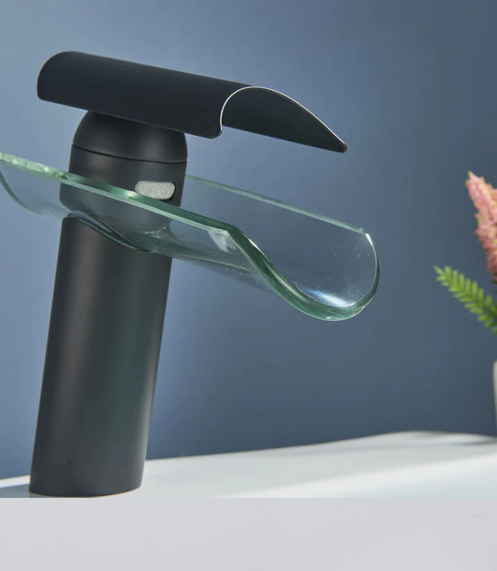 Exceptional bathroom mixer | Fountain and basin mixer | Transparent in Waterfall I With clear out-of-glass tempered/ Matt black