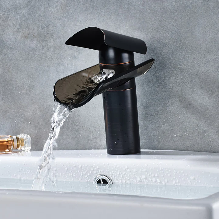 Mitigeur de salle de bains exceptionnel | Fontaine et mitigeur de lavabo | Transparent en Waterfall I Avec verre de sortie foncé (trempé)/Bronze avec noir