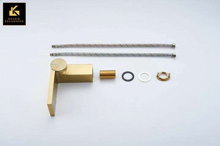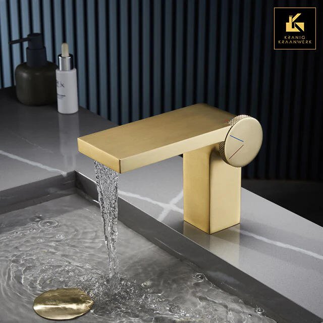 Badkamer | Design Mengkraan | Wastafel en fonteinkraan | De brede greep/ Geborsteld goud