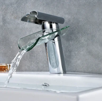 Uitzonderlijke badkamerkraan | Fontein en wastafel mengkraan | Transparant in Waterval I Met helder uitsroom glas gehard/ Chroom