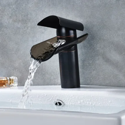 Uitzonderlijke badkamerkraan | Fontein en wastafel mengkraan | Transparant in Waterval I Met donker uitstroom glas(gehard)/Brons met zwart